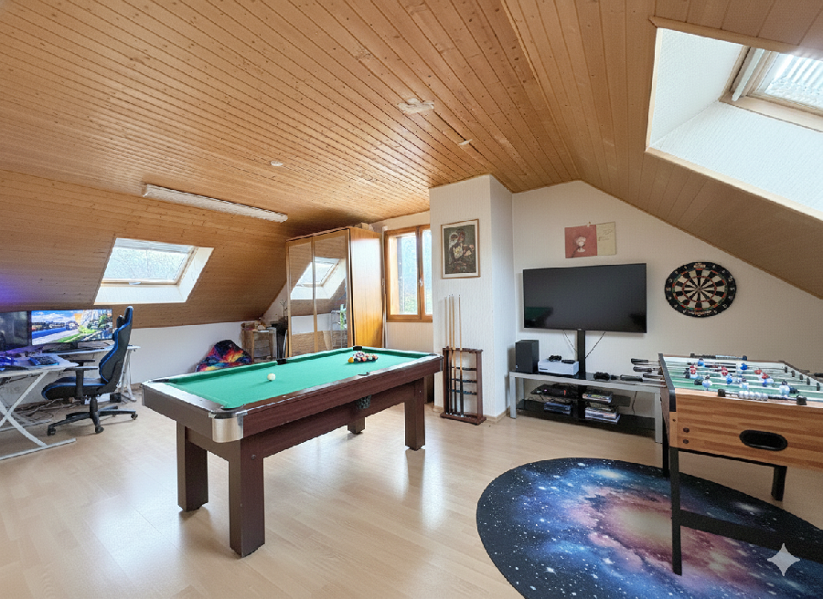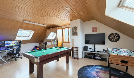 Découvrons l'étage : Les possibilités d'aménagement sont infinies dans cette pièce aux volumes généreux et baignée de lumière grâce aux vélux : le fameux coin détente/lecture/pouvant faire office de second salon, mais permettrait d'accueillir également, selon vos envies, une batterie (qui est le cas aujourd'hui), un billard, un baby-foot?. Mais aussi un bureau de travailles, une voire deux chambres supplémentaires ! Un volume rare, idéal pour créer un véritable univers familial ou offrir aux enfants un espace de jeux dédié, nous permettant à nous parents de souffler un peu !